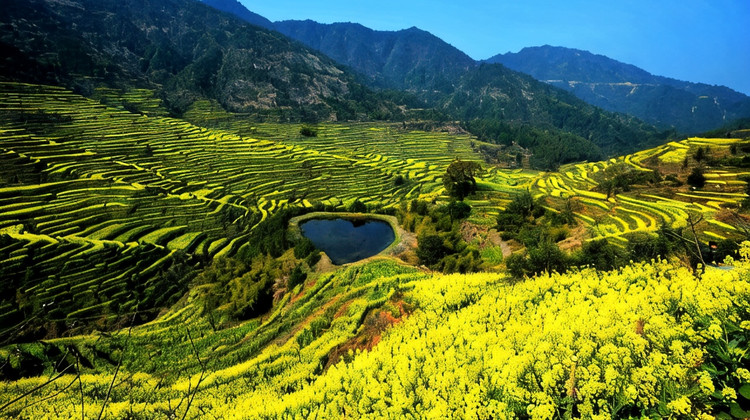 阳春三月,婺源篁岭景区数万亩层层叠叠的梯田上油菜花盛开,粉红的桃花、雪白的梨花点缀其中,是一副优美的水墨油画,在这里,你可以与大自然融为一体,与花海亲密接触。