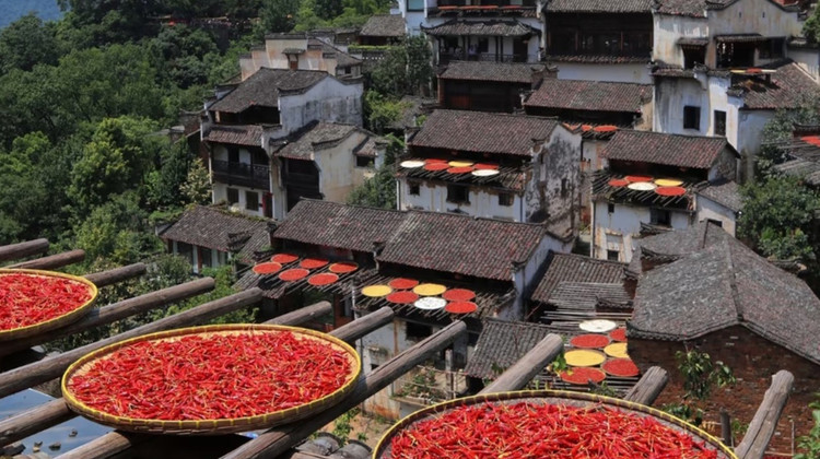 挂在山崖上的篁岭古村,地无三尺平,数百年来,村民早已习惯用平和的心态与崎岖的地形“交流”,绘就出了一处“晒秋人家”风情画。