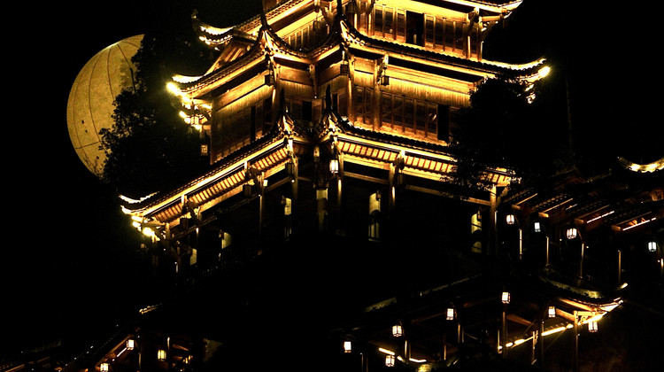 夜游望仙谷是从悬崖顶上朝鹤楼的灯光闪烁开始。“望仙谷的灯光秀不同别处,自带玉宇琼楼的仙气。仰望白鹤崖,从朝鹤楼上喷薄而出的光柱,冲破雨雾,散发光芒。丝丝光柱,缕缕如烟,似箭,似柱,指向夜空。朝鹤楼的灯光秀,也不总是保持一种姿态。她时而直射,时而平扫,变换不同身姿,也变换不同色彩,多彩的灯光,轻抚山岚,时而如彩带,时而如秀发,飘飞仙谷,轻抚楼宇,绕过山涧,拥抱林木,最后将七彩余光照进瀑布,融入溪流,幻影成仙”。夜幕下的望仙谷灯火通明,从高处俯瞰,整个山谷流光溢彩,灯光亮起的一瞬间,一整个惊艳住,悬崖边的房子和夜晚灯火通明的夜景集市,仿佛一下带您进入宫崎骏的动漫世界。
