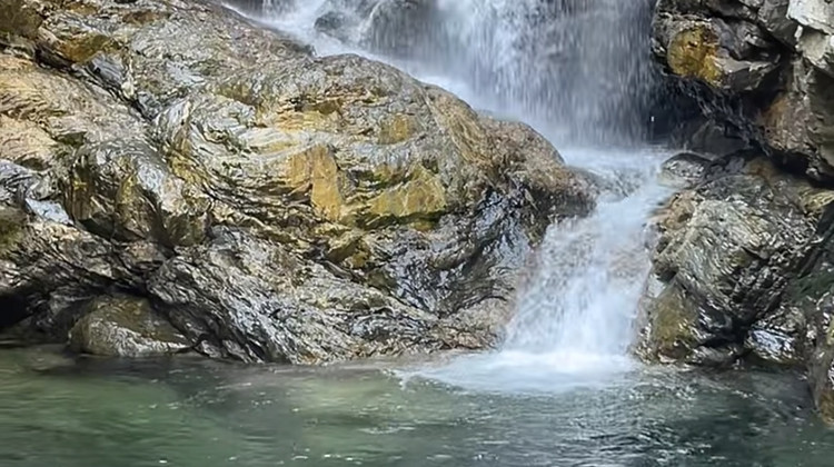 ['瀑布冲击形成暗绿色的深潭']