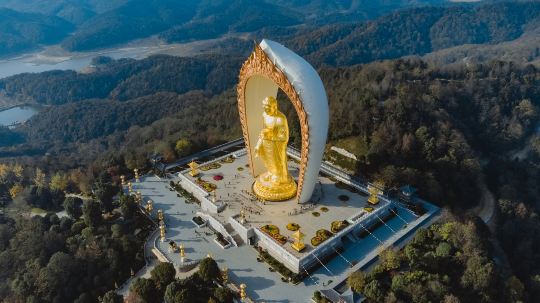 世界较高的阿弥陀佛铜像——48米高的东林大佛,这座金灿灿的大佛屹立在高山之巅,48米高的东林大佛整体造型吸收了龙门石窟等盛唐佛像优点,代表了当代较高水平的宗教艺术精品,中国少有的露天阿弥陀佛铜像。