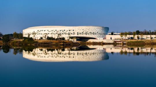 建筑形制提取了刘贺墓出土的文物中多次出现的龙形图案,寓意虬龙蛰伏在阡陌山野,建筑面积为39296平方米。我们给它的定位是文化展示、文化体验等。遗址博物馆有出土文物的展览、展示,也有如4D影院、VR体验等项目。