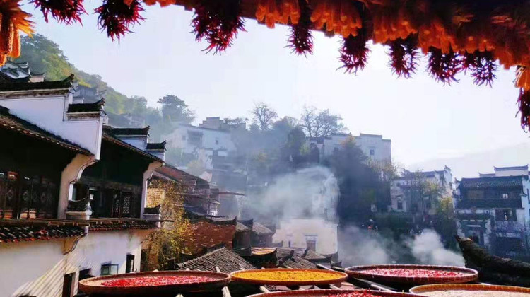 挂在山崖上的篁岭古村,地无三尺平,数百年来,村民早已习惯用平和的心态与崎岖的地形“交流”,绘就出了一处“晒秋人家”风情画。