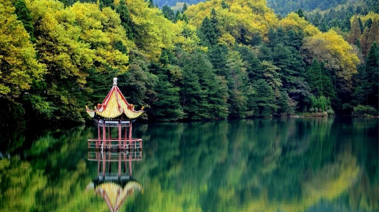 黄龙潭幽深、静谧,古木掩映的峡谷间,一道溪涧穿绕石垒而下,银色瀑布冲击成暗绿色的深潭。静坐潭边,听古道落叶、宿鸟鸣涧,自然升起远离尘世、超凡脱俗之感。
