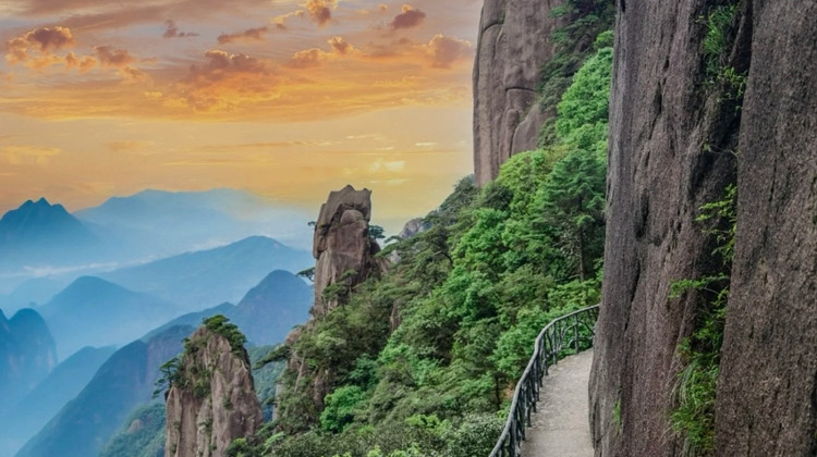 从东部金沙索道上山的游人较多,上来即是精华的南清园景区。大约半小时走到“巨蟒出山”,左边不远便是“东方女神”。往西过玉皇顶、“三龙出海”走上三清山-阳光海岸的高空栈道,可俯瞰下面的田园风光。三清山-阳光海岸和后面的三清山风景区-三清福地-西海岸景区正好串成一个环形旅游线路,三清山风景区-三清福地的道教古建筑群以三清宫为核心,依据“先天八卦图”的方位布局,十分精巧。其中,风雷塔是许多游客争相合影的地方。在此休整一会儿,继续往前便是西海岸景区的高空栈道。栈道靠近三清宫的地方,“猴王献宝”也是山中的奇石之一。下午正好在栈道上看云海和晚霞。