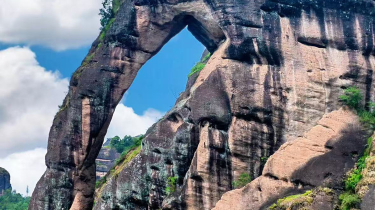 云锦披不得:此峰若一面色彩斑斓的云锦,峰前的河面也被山色染成五彩的。此峰陡峭如壁,宽幅百丈,宽大、高峻、平整,不愧是丹霞地貌杰出的代表作。