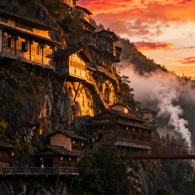 西海岸景区是景区观景开阔的平台,让人称奇的高空栈道也正是位于此。步行在高空栈道上,感受悬崖绝壁之上闲庭信步的乐趣,欣赏连绵群峰、幽深峡谷的壮观之景,还可远看晚霞、云海的绚丽秀美。