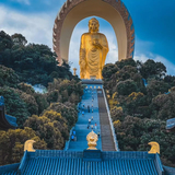 世界较高的阿弥陀佛铜像——48米高的东林大佛,这座金灿灿的大佛屹立在高山之巅,48米高的东林大佛整体造型吸收了龙门石窟等盛唐佛像优点,代表了当代较高水平的宗教艺术精品,中国少有的露天阿弥陀佛铜像。