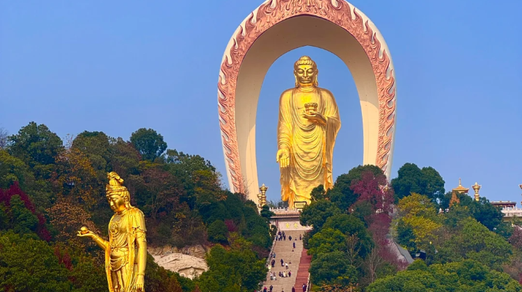 世界较高的阿弥陀佛铜像——48米高的东林大佛,这座金灿灿的大佛屹立在高山之巅,48米高的东林大佛整体造型吸收了龙门石窟等盛唐佛像优点,代表了当代较高水平的宗教艺术精品,中国少有的露天阿弥陀佛铜像。