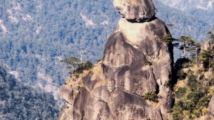 巨蟒出山是一座象形石柱,经大自然长期的风化与重力作用而形成,峰壁峭立,顶部稍平,颈部略细,就像一条破山而出的巨蟒,可谓是大自然的鬼斧神工。它与东方女神观遥遥相对,从金沙索道(东部索道)上山后到南清园景区游玩途中便可欣赏到。